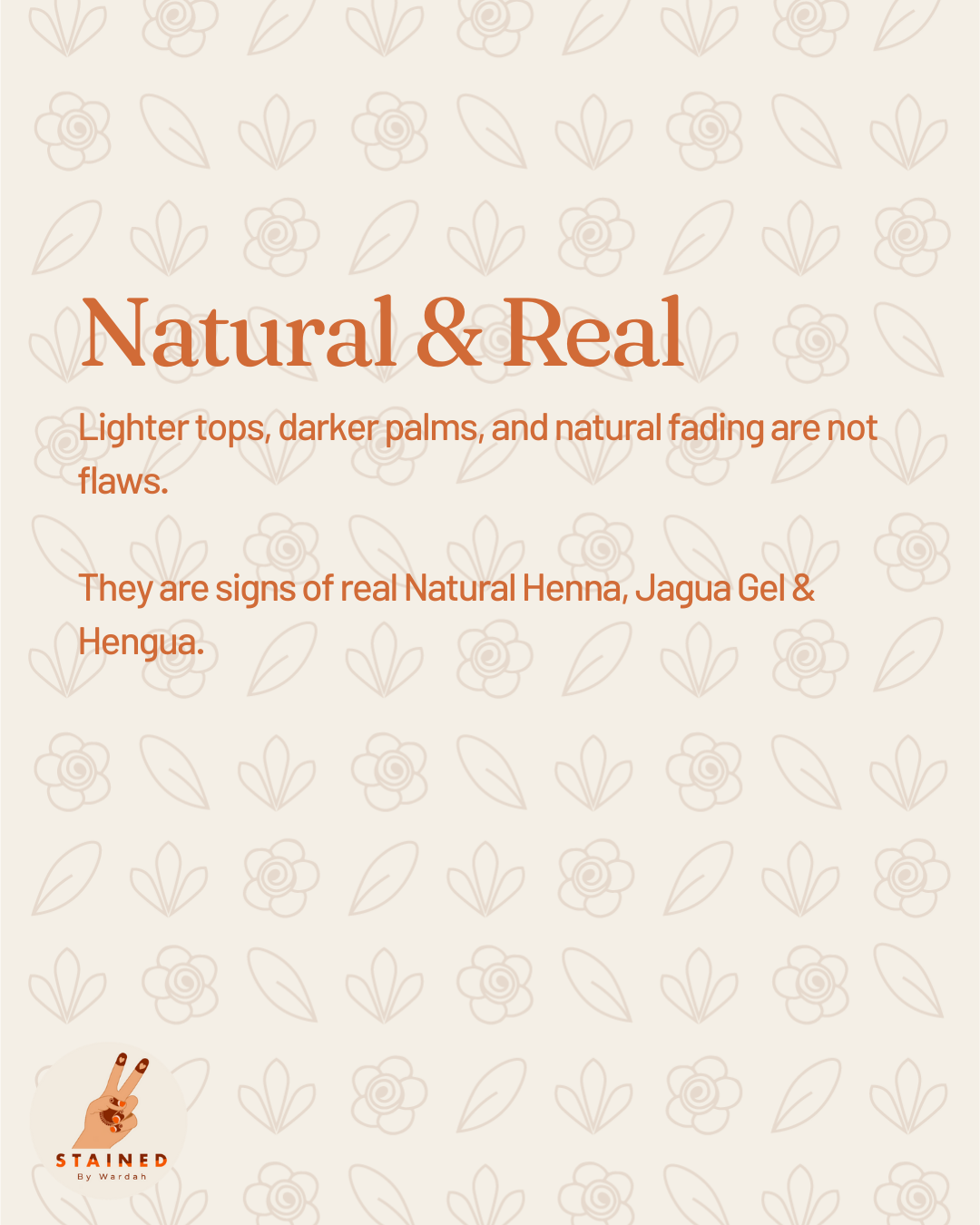Please take time to familiarise yourself with how Natural henna, Jagua Gel and Hengua stains develop. Reference visuals are available on our Instagram posts and Story Highlights labelled 'Stains'. We also recommend viewing all images in the carousel informing you how Natural Henna, Jagua Gel & Hengua stain works.