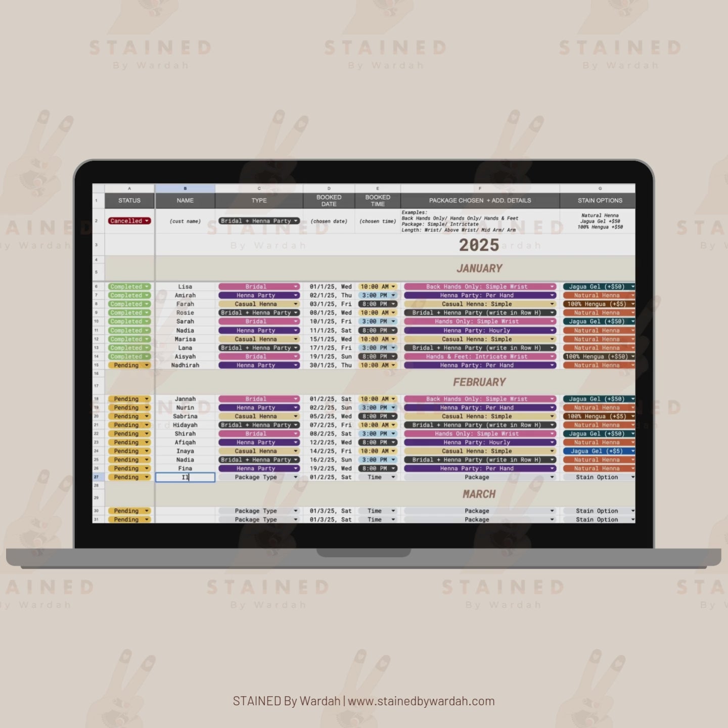 Stay organised and on top of your henna business with this comprehensive appointment tracker designed specifically for henna artists. This easy-to-use Google Excel Sheet not only helps you efficiently manage client bookings, but it also calculates your profits automatically for each appointment. Whether you’re a beginner or a seasoned professional, this tracker streamlines your workflow, saving you time and allowing you to focus on creating beautiful art. A highly organised, intuitive, and adaptable appointment tracker designed for long-term planning spanning 3 years with the flexibility to allow you to schedule future appointments and accommodate new ones!